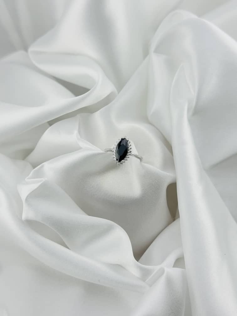 Sofisticado anillo con piedra negra en corte marquise, rodeada de delicados destellos que resaltan su elegancia y misterio. Elaborado en plata italiana 925, es la pieza ideal para quienes buscan un accesorio versátil, moderno y con un toque de distinción atemporal.