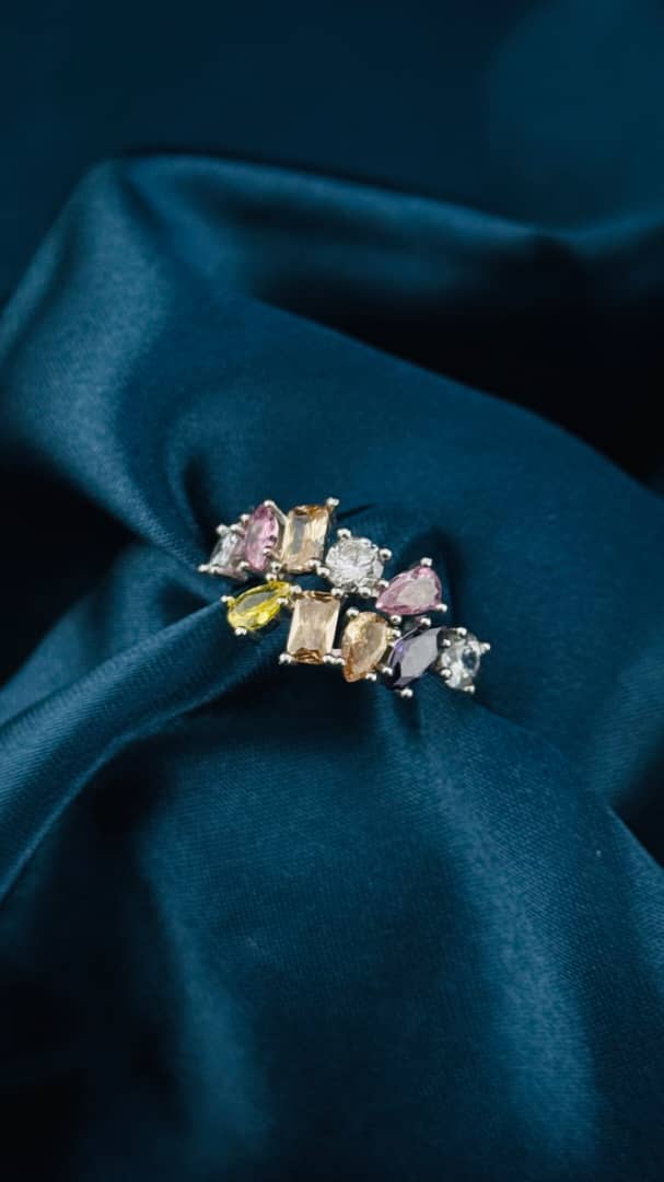 Este anillo en plata italiana 925 destaca por su diseño elegante y contemporáneo, adornado con circonias de diferentes colores y cortes (redondo, pera y baguette), que aportan brillo y un estilo único. Ideal para realzar cualquier look con un toque moderno y sofisticado.