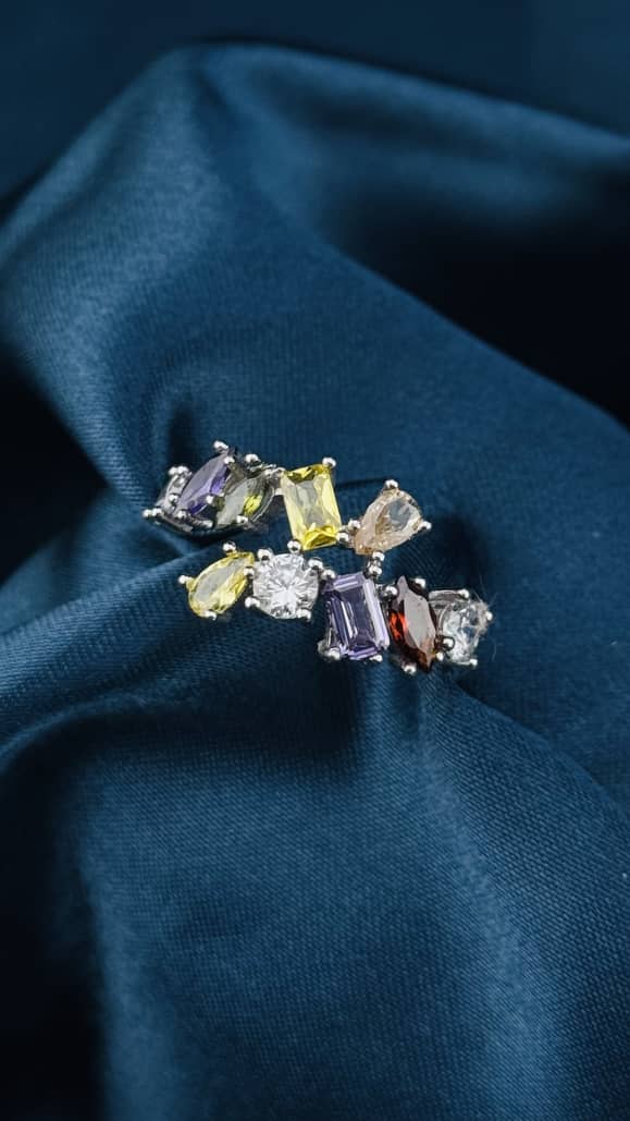Un anillo moderno y elegante en plata italiana 925, con circonias de colores vivos en distintos cortes que aportan un estilo único y sofisticado. Ideal para quienes aman destacar con accesorios versátiles y brillantes.