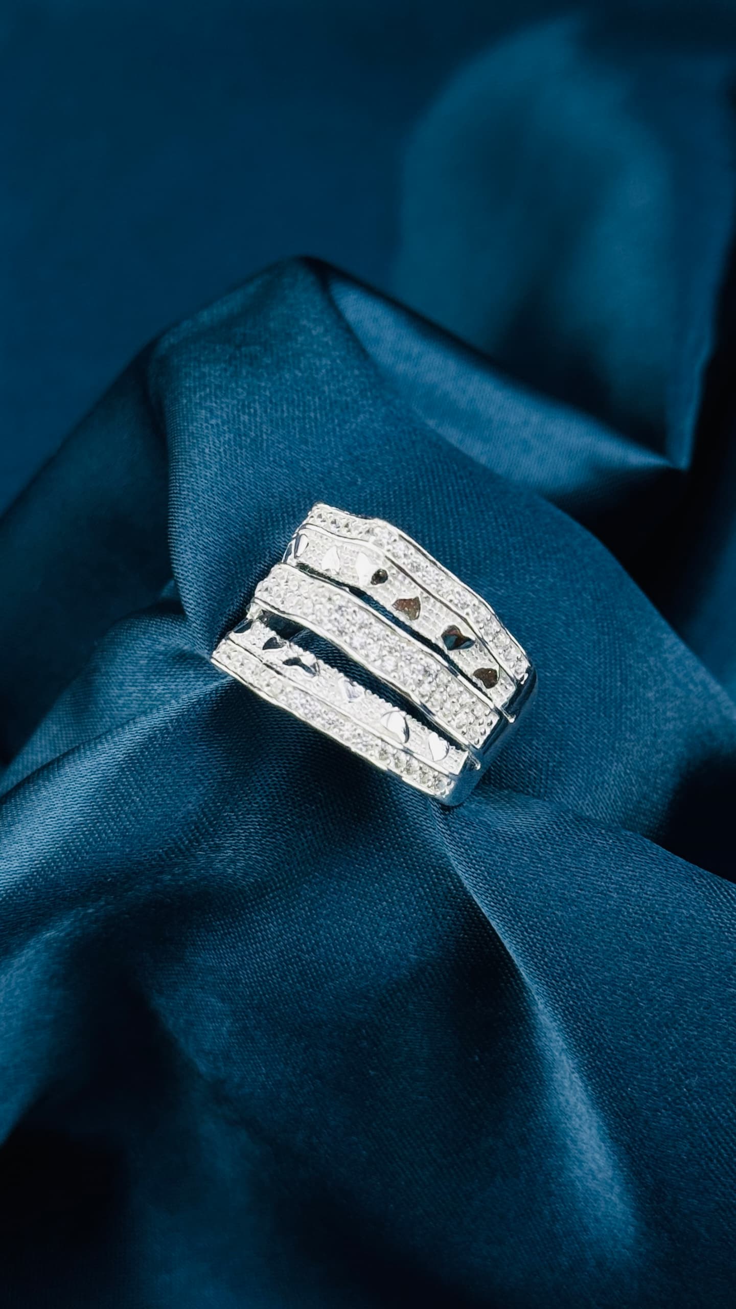 Un diseño único y llamativo con tres franjas texturizadas, incrustaciones brillantes y delicados corazones calados que aportan un toque romántico. Elaborado en plata italiana 925, este anillo es perfecto para quienes buscan una joya moderna con un detalle especial y lleno de estilo.