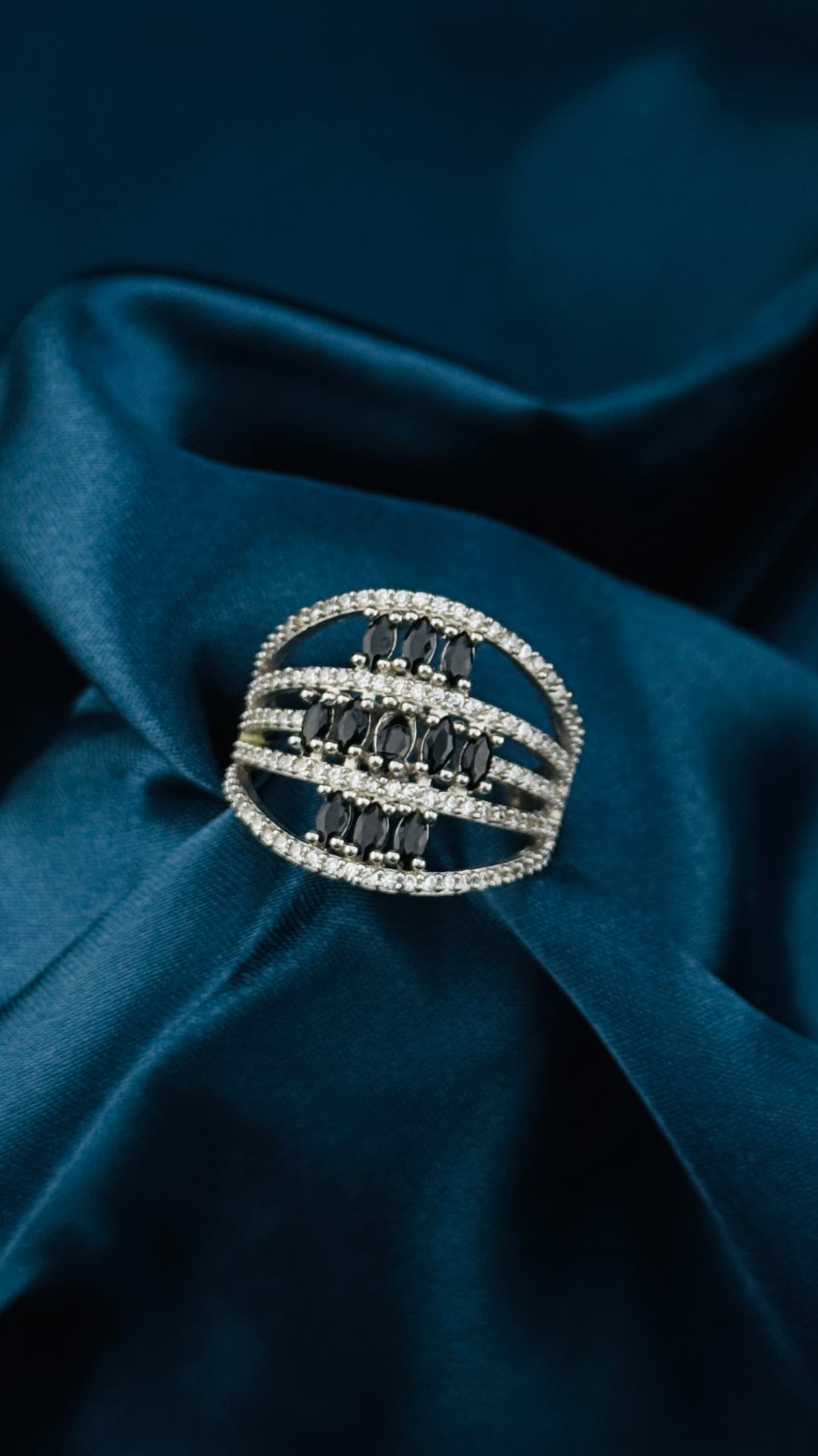 Moderno anillo de varias líneas adornado con circonias negras al centro, enmarcadas por destellos brillantes que realzan su diseño sofisticado. Elaborado en plata italiana 925, combina elegancia y originalidad, ideal para quienes buscan un accesorio con carácter único.
