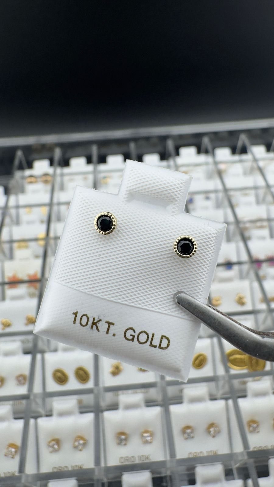 Modernos y elegantes aretes con piedra negra facetada en forma redonda, enmarcada por un delicado borde texturizado que realza su contraste con el oro. Un diseño atemporal que combina sobriedad y estilo, ideal para cualquier ocasión. Fabricados en Oro 10K, con sistema de enroscar para mayor seguridad y comodidad.