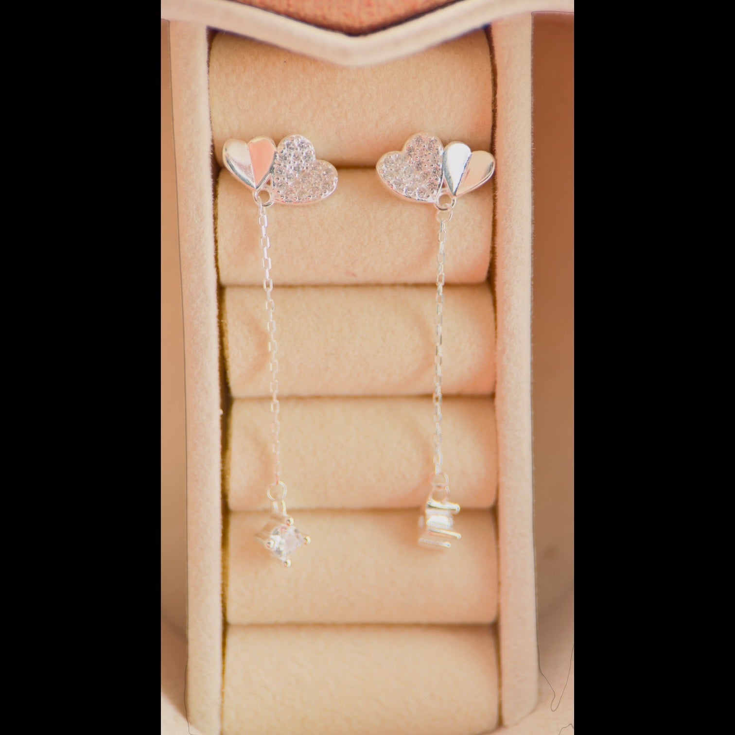 Aretes Corazón Doble con Dije Cuadrado en Plata 925
