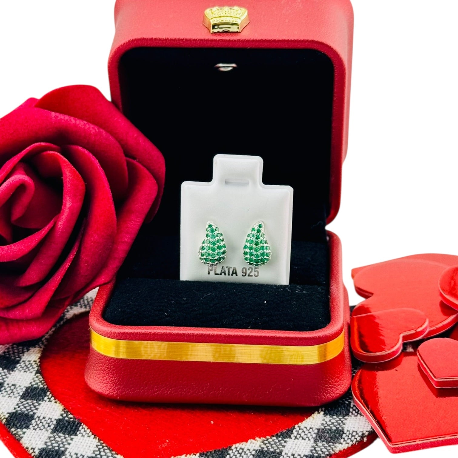 Un diseño elegante en forma de gota, completamente cubierto de zirconias verdes en estilo pavé que aportan brillo intenso y un acabado sofisticado. Elaborados en Plata 925, son una pieza llamativa pero refinada, ideal para quienes buscan destacar con elegancia.