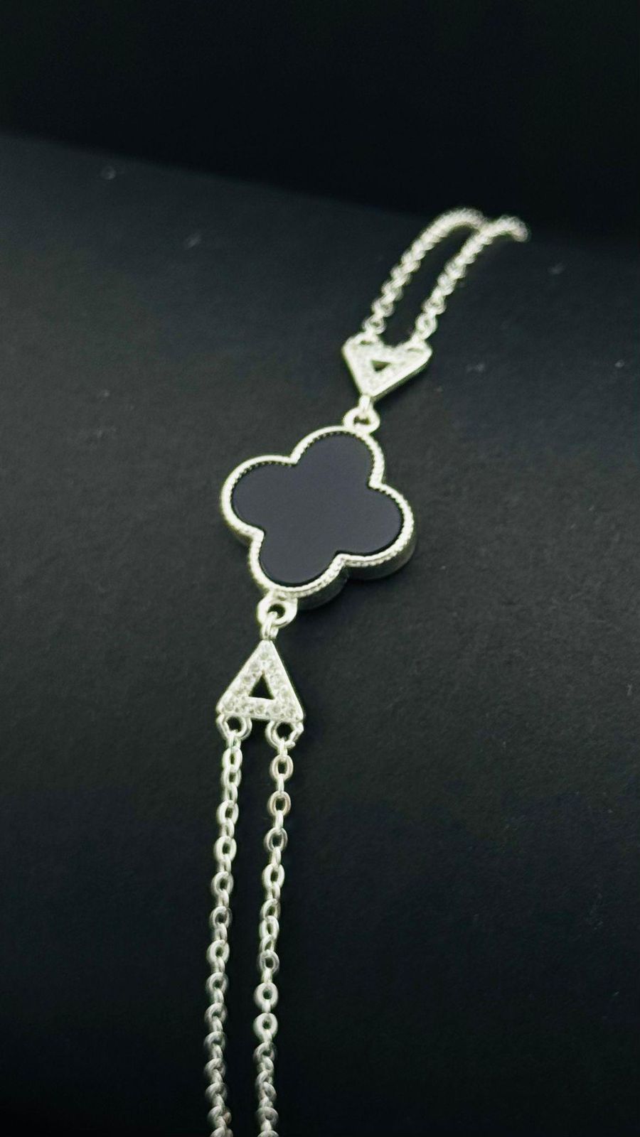 Envuelve tu muñeca con el misterio y la elegancia de nuestro brazalete "Trébol Nocturno". Este diseño presenta un llamativo trébol esmaltado en negro, bellamente contorneado con brillantes circonitas cúbicas. El trébol está flanqueado por delicadas cadenas adornadas con triángulos también con circonitas, añadiendo un brillo sutil. Fabricado con auténtica plata 925 italiana, este brazalete es una pieza sofisticada y versátil.