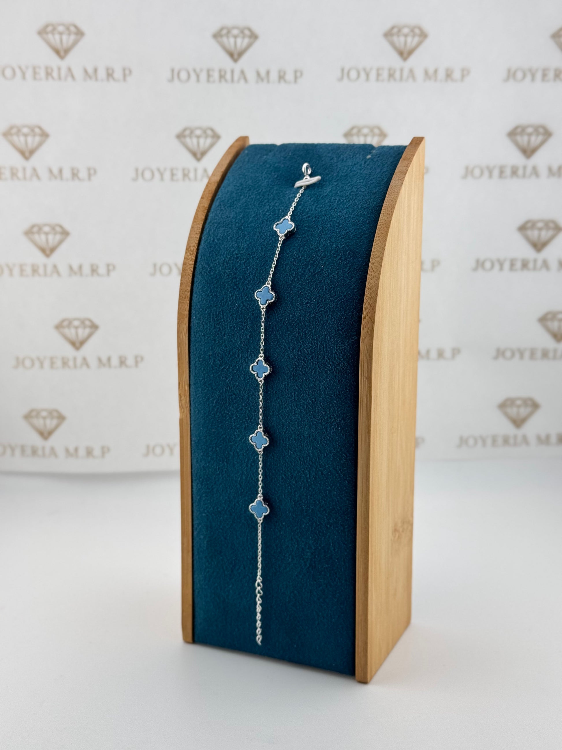 Una pulsera delicada y moderna compuesta por cinco tréboles de 8 mm en tono azul, distribuidos armoniosamente a lo largo de la cadena para lograr un diseño ligero, femenino y sofisticado.
