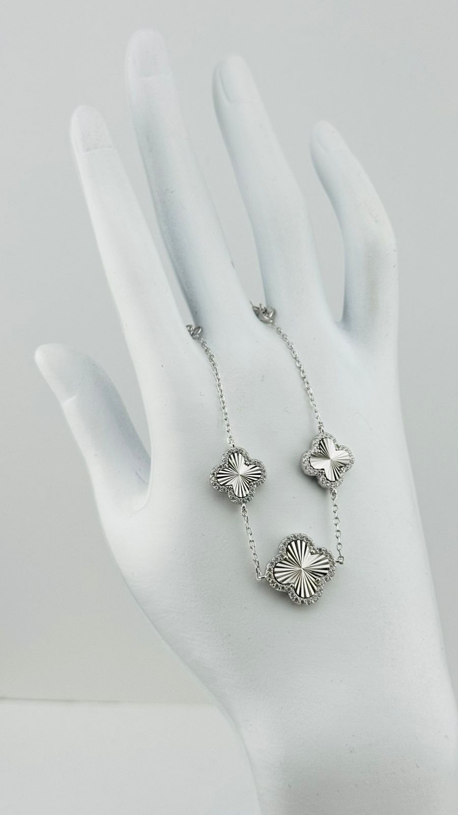 Eleva tu estilo con esta pulsera que fusiona la textura y el brillo. Presenta tres motivos de trébol en tono plata; cada uno combina un centro con un elegante grabado radial y un contorno con un delicado micropavé de zirconias que maximiza su luminosidad. Esta joya es de alta calidad, elaborada en Plata, garantizando un acabado brillante y resistente al deslustre.