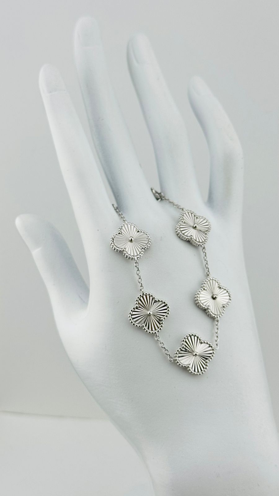 Añade un toque de brillo glacial a tu colección con esta pulsera de tréboles en tono plata. Los motivos están finamente grabados con un diseño solar radial, ofreciendo una textura sofisticada y un destello elegante. Esta pulsera esta elaborada en Plata, garantizando una calidad superior y un acabado de alta resistencia. ¡Un accesorio indispensable para un look chic y atemporal!
